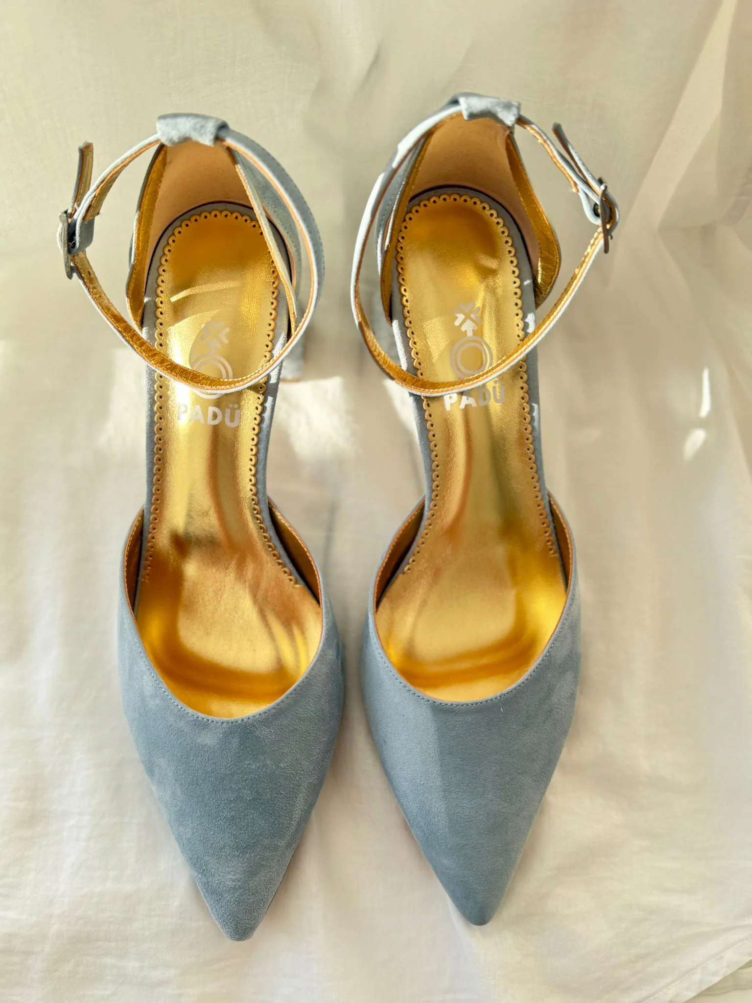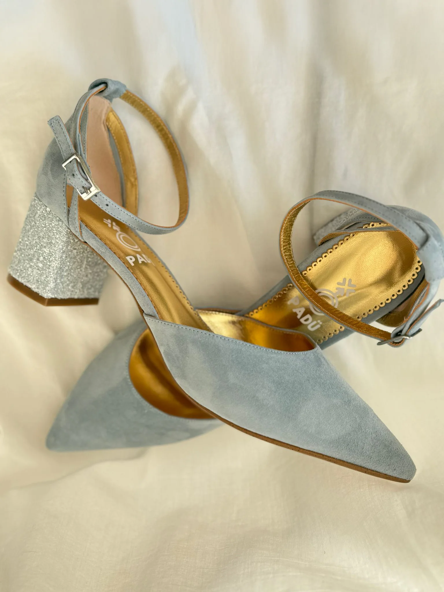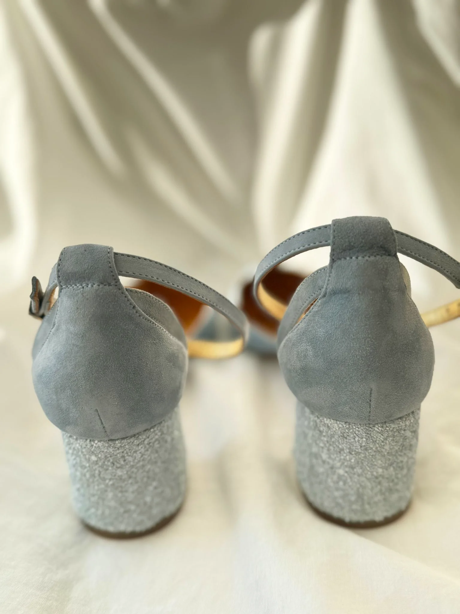 Nuestro modelo Cecilia es un salón hecho en ante, semiabierto con escote redondo y pala lisa con tacón ancho de 5,5cm forrado en glitter nacarado y tira al tobillo.