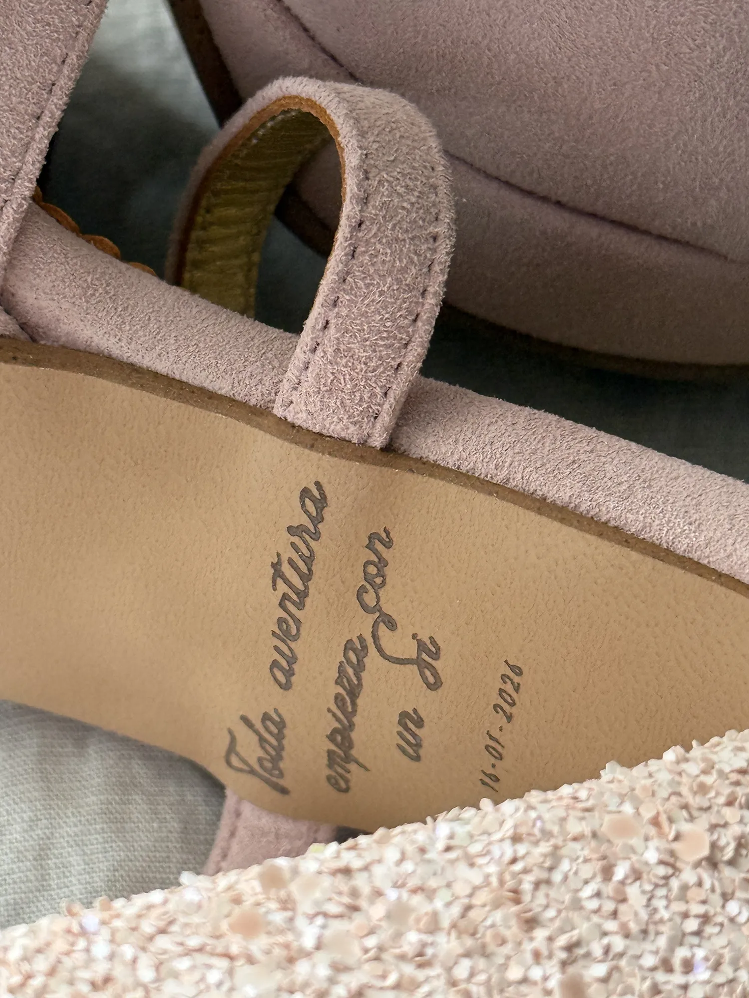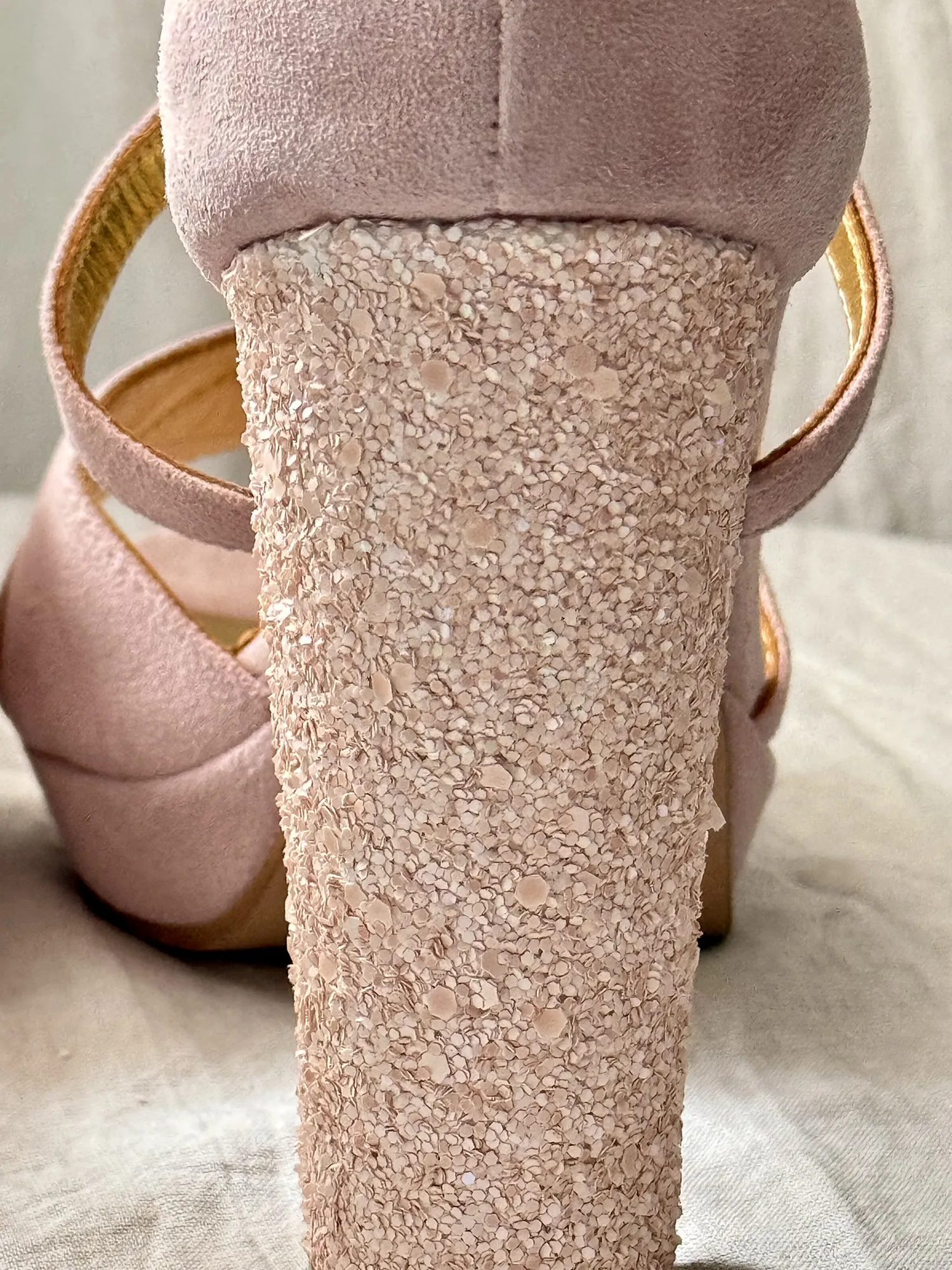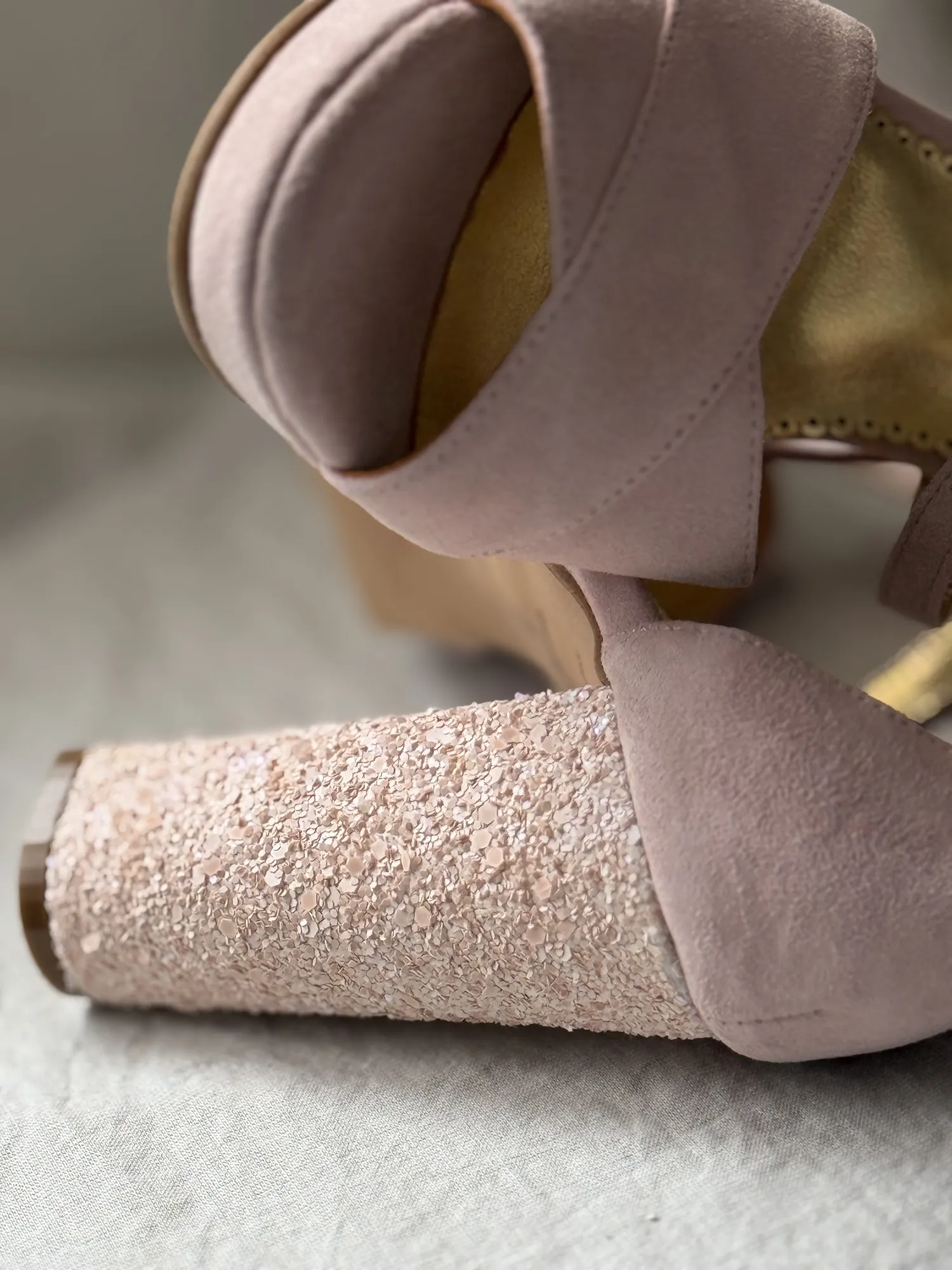 Esta sandalia está fabricada en ante color rosa pastel con tacón en glitter rosa pastel y plantilla doble gel.